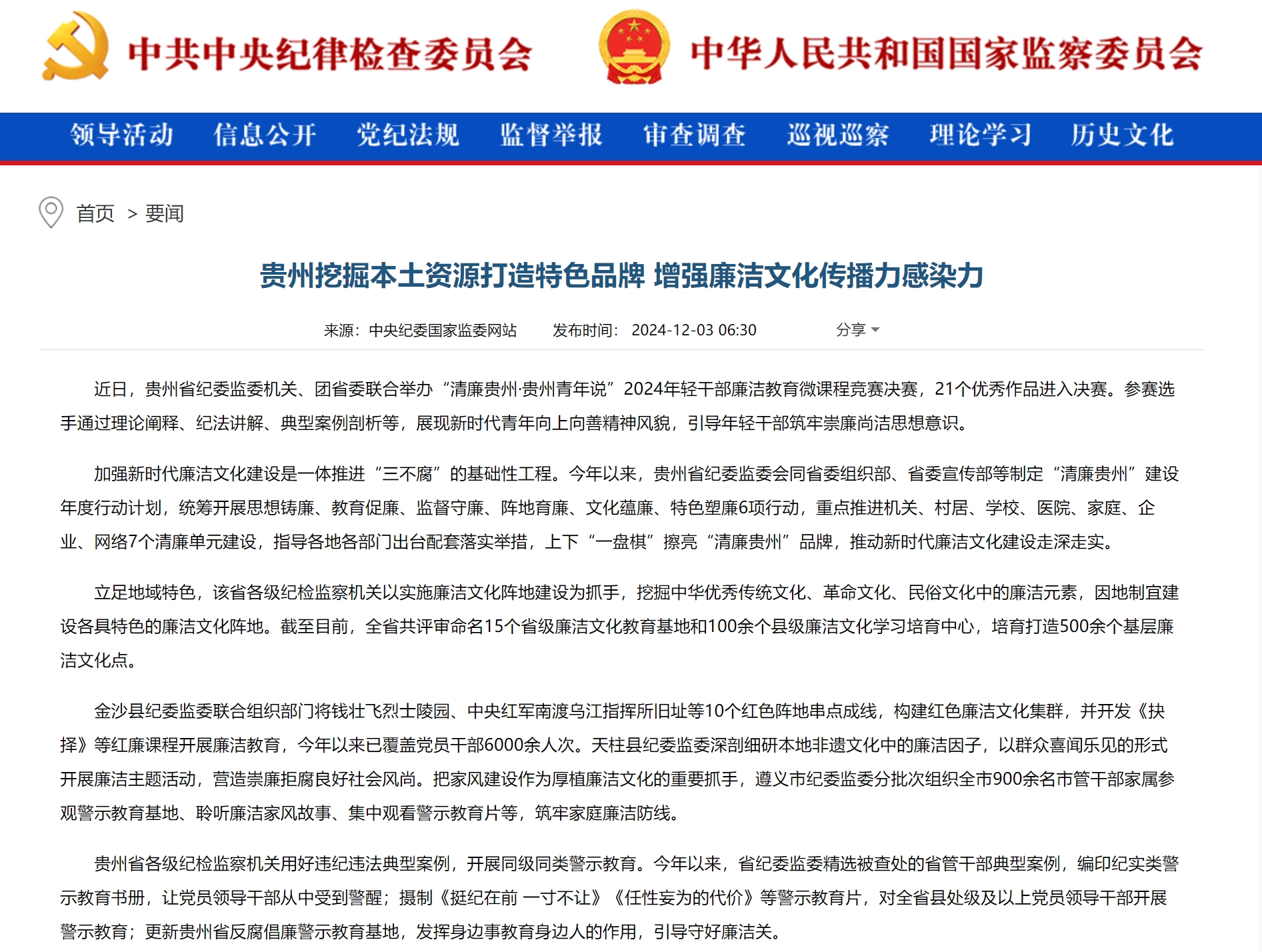 《中国纪检监察报》、中央纪委国家监委网站|贵州挖掘本土资源 打造特色品牌增强廉洁文化传播力感染力