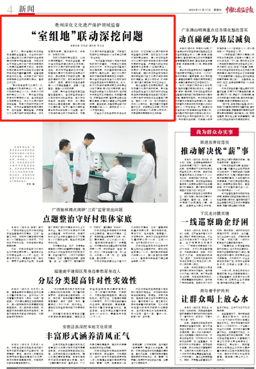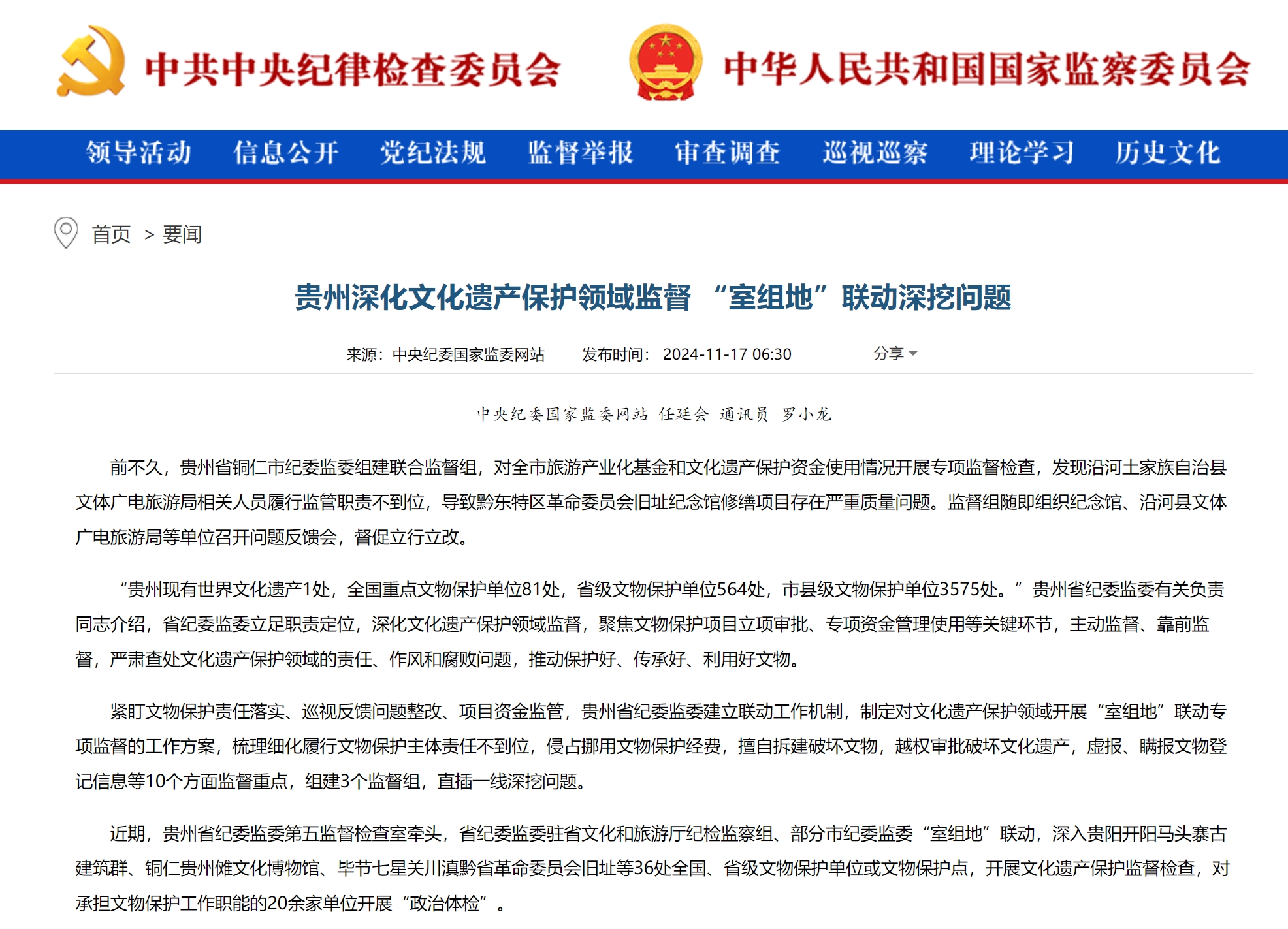 《中国纪检监察报》“新闻”版头条、中央纪委国家监委网站| 贵州深化文化遗产保护领域监督 “室组地”联动深挖问题 ——专项监督护航贵州高质量发展系列报道⑱