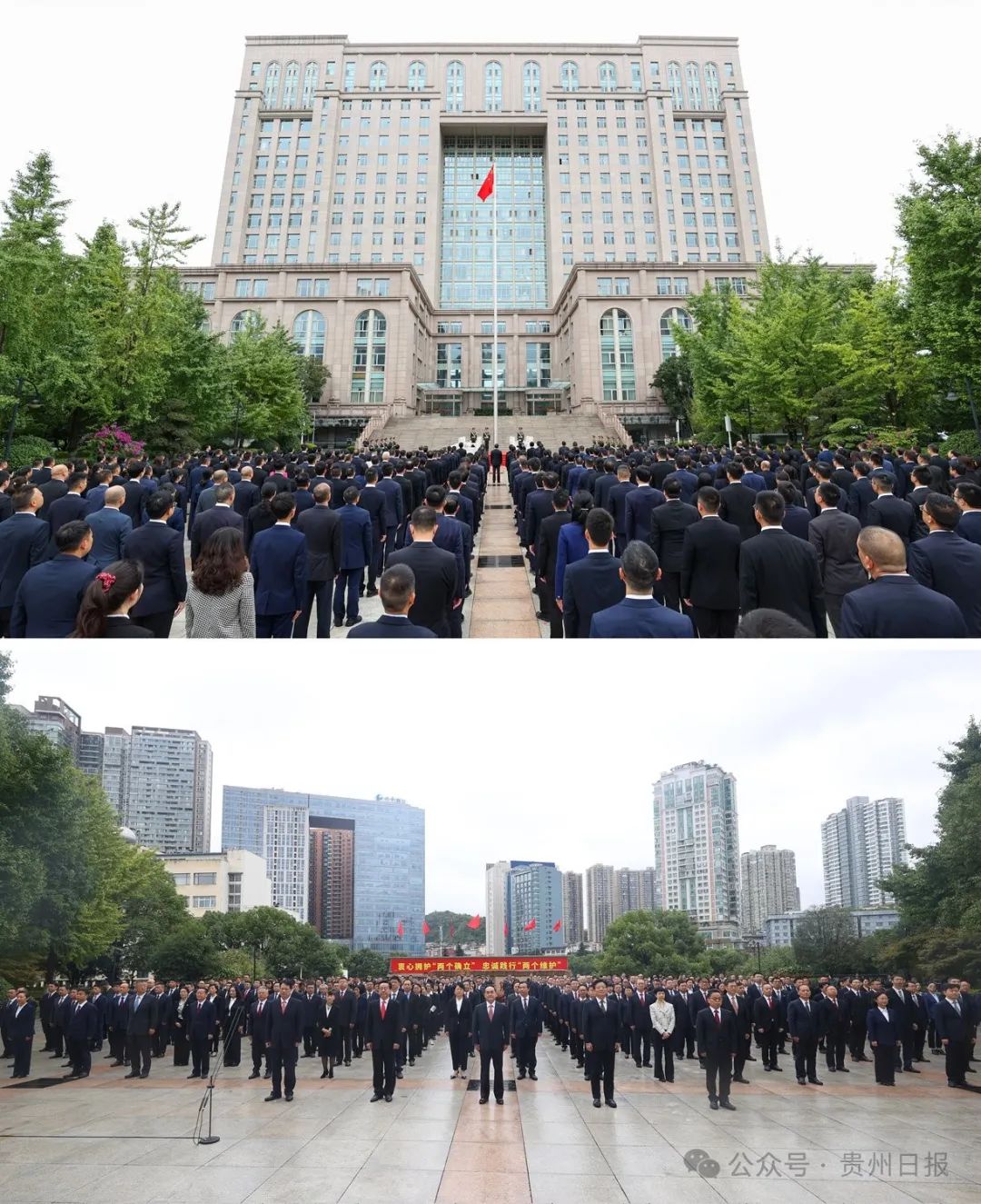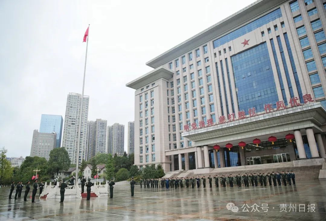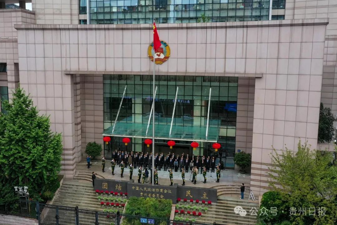节日里的黔中大地,红旗招展、花团锦簇,洋溢着喜庆热烈的氛围。在各机关驻地,国旗护卫队队员迈着铿锵有力的步伐,护卫着五星红旗来到国旗杆下。伴随着《义勇军进行曲》响起,鲜艳的五星红旗冉冉升起,迎风飘扬。全体人员面向国旗行注目礼,齐声高唱国歌,共同祝愿伟大祖国繁荣昌盛,由衷表达热爱中国共产党、热爱社会主义、热爱祖国、热爱人民的深厚情怀。