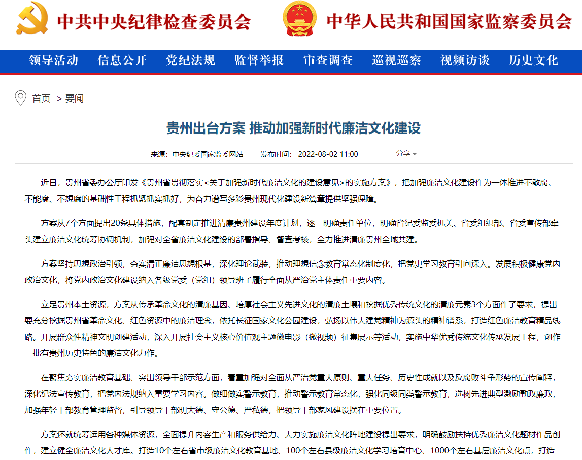 中央纪委国家监委网站|贵州出台方案 推动加强新时代廉洁文化建设